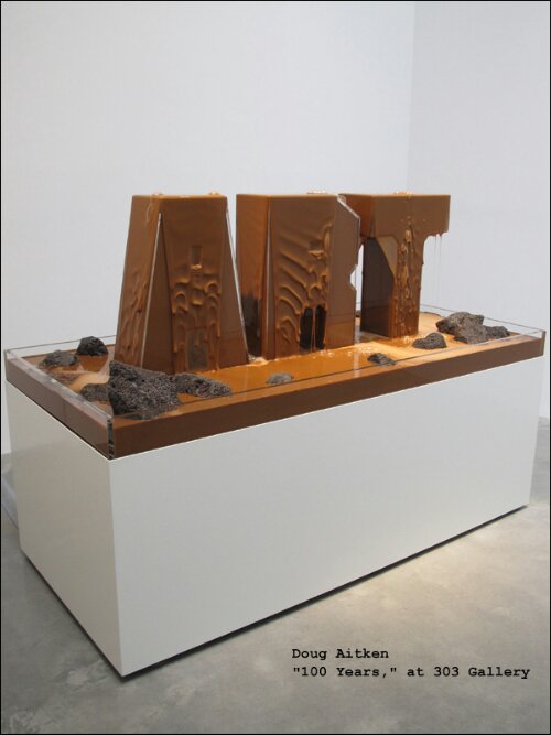 In Doug Aitken’s “100 Years,” at 303 Gallery, the viewer is presented with a rhythmically timed flow of ceiling-fed water drops that fall into a sunken pool in the center of the gallery. In addition, another piece features the word “Art” rendered in three dimensions and perpetually dripping with a caramel-like liquid. You can view a video of Aitken’s installation at http://www.303gallery.com.