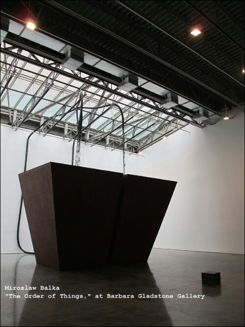 Miroslaw Balka’s “The Order of Things,” at Barbara Gladstone Gallery, is a monumental installation comprised of two massive steel tanks that recall the work of Richard Serra. The tanks are positioned under two rubber hoses that continually spout a loud rush of black water. The installation is impressive in both scale and presentation. The viewer is led to a small door in the quiet gallery lobby and then finds him- or herself overwhelmed by this loud and imposing structure that resides on just the other side of the door.
