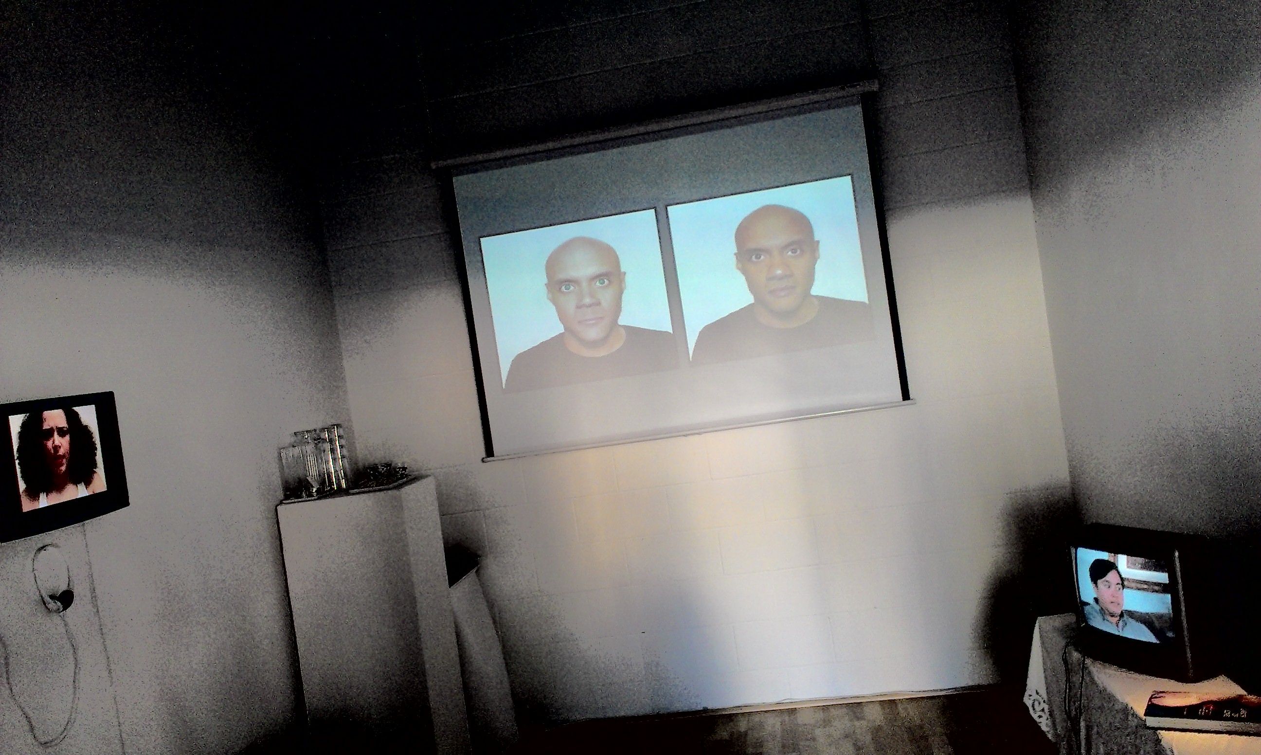 Through two adjacent loops, Tim Roseborough’s Facial Deconstruction (after Michael Jackson) (2008) presents the artist’s process as he digitally manipulates his own face to copy the facial changes of the superstar over time. Renditions of Jackson’s vocal acrobatics narrate the the images as they run continually in both directions. Chris Vargas’s video Extraordinary Pregnancies (2010) revisits the “First” Pregnant Man, Thomas Beatie and his wife Nancy, re-scripting their vulnerable, yet guarded interviews with the big shots of tabloid media. Using original footage from interviews with Barbara Walters and others, Vargas proposes his own alternative answers to the proposed questions of gender and propriety. In Elizabeth Axtman’s American Classics (2005), the artists inhabits characters discussing race and blackness and takes the conversation to the audience by facing us close up and mouthing lines from vintage film clips. The effect is one of direct dialogue with the viewer, making the conversation a personal one, while reflecting on the history presented in these films.